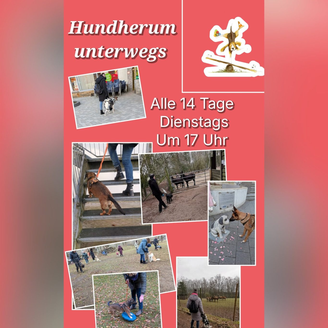 Alle 14 Tage Dienstags (gerade Woche) treffen wir uns fürs "Hundherum unterwegs" Training.